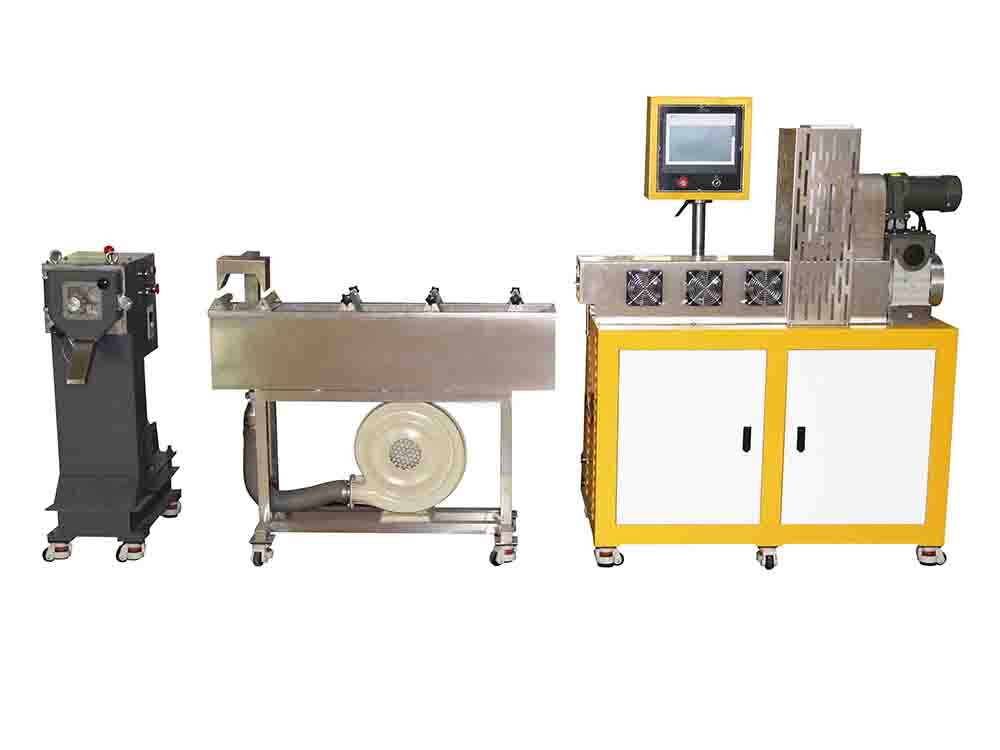 本機(jī)主要由主驅(qū)動(dòng)電機(jī)、傳動(dòng)裝置、擠出裝置、加料斗、電控系統(tǒng)、模頭等組成.其工作原理為:物流從料斗里放入經(jīng)過(guò)擠出裝置的塑化和擠出變?yōu)榱餮訝顟B(tài),再?gòu)闹鳈C(jī)經(jīng)模頭出來(lái),擠出機(jī)組的用途不同其選配用的輔助設(shè)備也不盡相同。